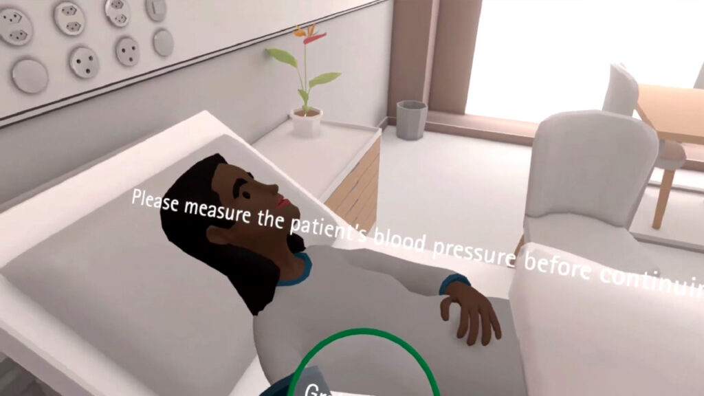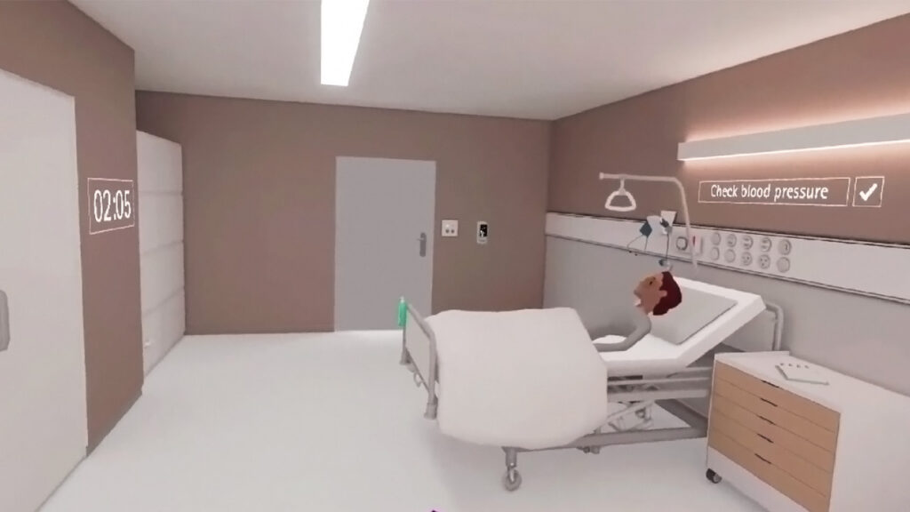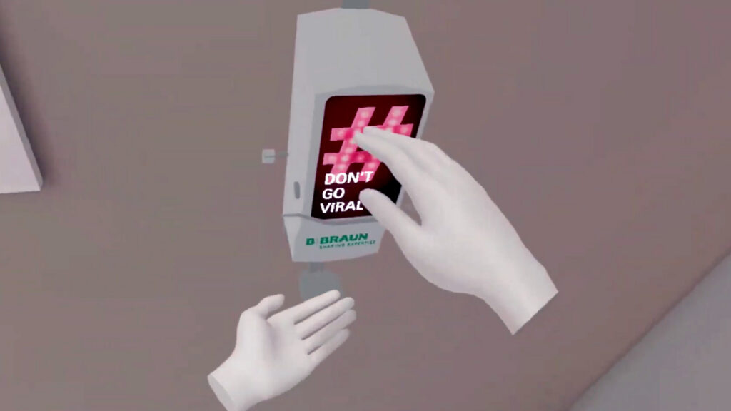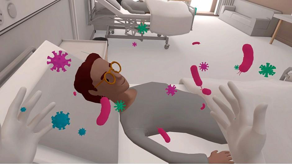 The VR game “Germbusters” immerses players as a nurse in a virtual hospital, tasked with measuring two patients’ blood pressure under strict hygiene rules. Missing a step causes bacteria to spread, ending the game. Success requires both speed and accuracy to earn points.